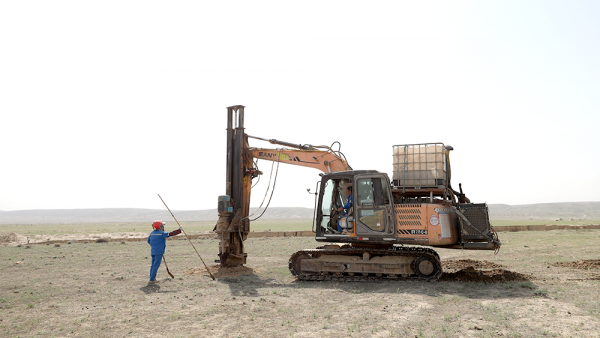 4月16日,記者來到位于獨山子城區東約25公里處的戈壁上,看到施工人員正利用鉆機在地面鉆出一排排近兩米深的孔洞。部分孔洞正在埋入鋼筋混凝土結構并加固,形成一個個地面支架,后期就可以在上面安裝發電用的光伏板。